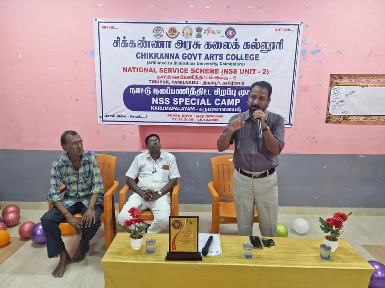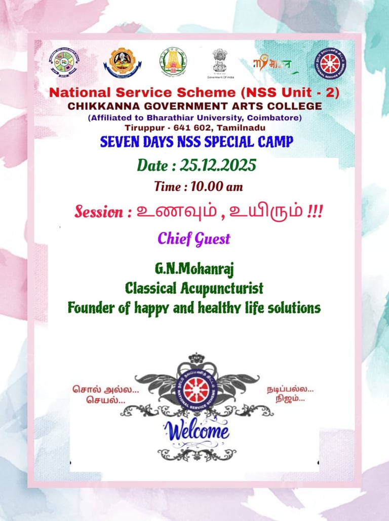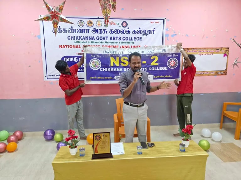 25-12-2025 அன்று சிக்கண்ணா அரசு கலைக்கல்லூரி நாட்டு நலப்பணித் திட்ட முகாமில் சிறப்பு விருந்தினராக கலந்துகொண்டு மாணவர்களிடையே உணவும் உயிரும் என்ற தலைப்பில் உரையாற்றினேன்.